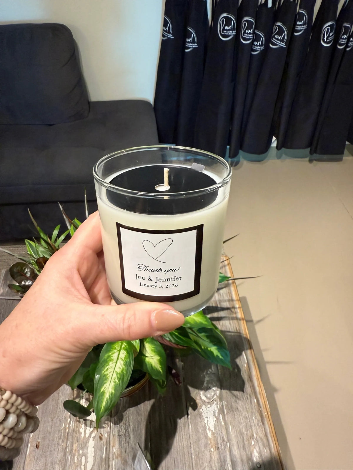 We can create custom candles with your business logo or a customized label for your wedding, baby or bridal shower, or any other special event. You can also choose your scent from 50+ options, and we can even create your own unique scent by mixing several scents together!