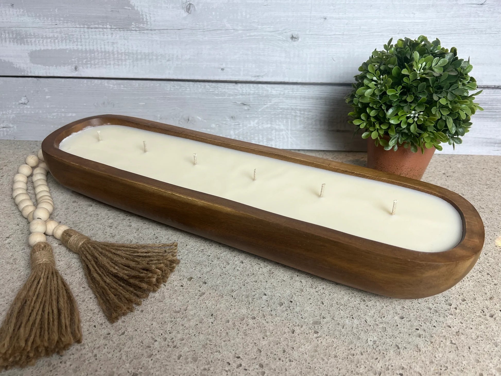 Sophie Kate Candles are aromatherapy candles made with all-natural soy wax and a cotton fiber wick. Our candles contain only the highest quality essential oil/fragrance oil blends that are non-toxic, vegan, and phthalate and paraben free. All of our wooden dough bowls and blocks are refillable with one of our easy-to-use refill kits or refill service! Average dimensions for 6 wick oval bowls: L 19 in x W 6 in x H 3 in. and range in volume from 32-34 ounces (these bowls are elongated). Our Boho collection bowls are made out of acacia wood and are a bit more elegant than our Farmhouse bowl collection. Each bowl is hand-carved and treated with a fire retardant, so they are as safe as they are beautiful! These candle bowls are more than just a candle, they're home decor with a scent throw that fills the entire room!