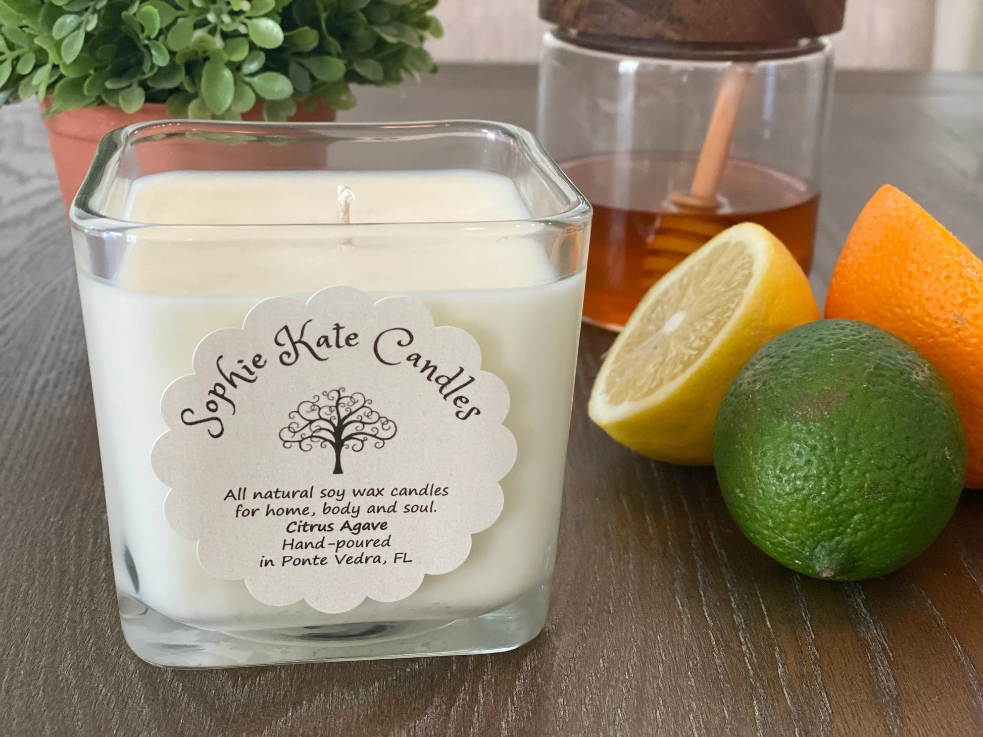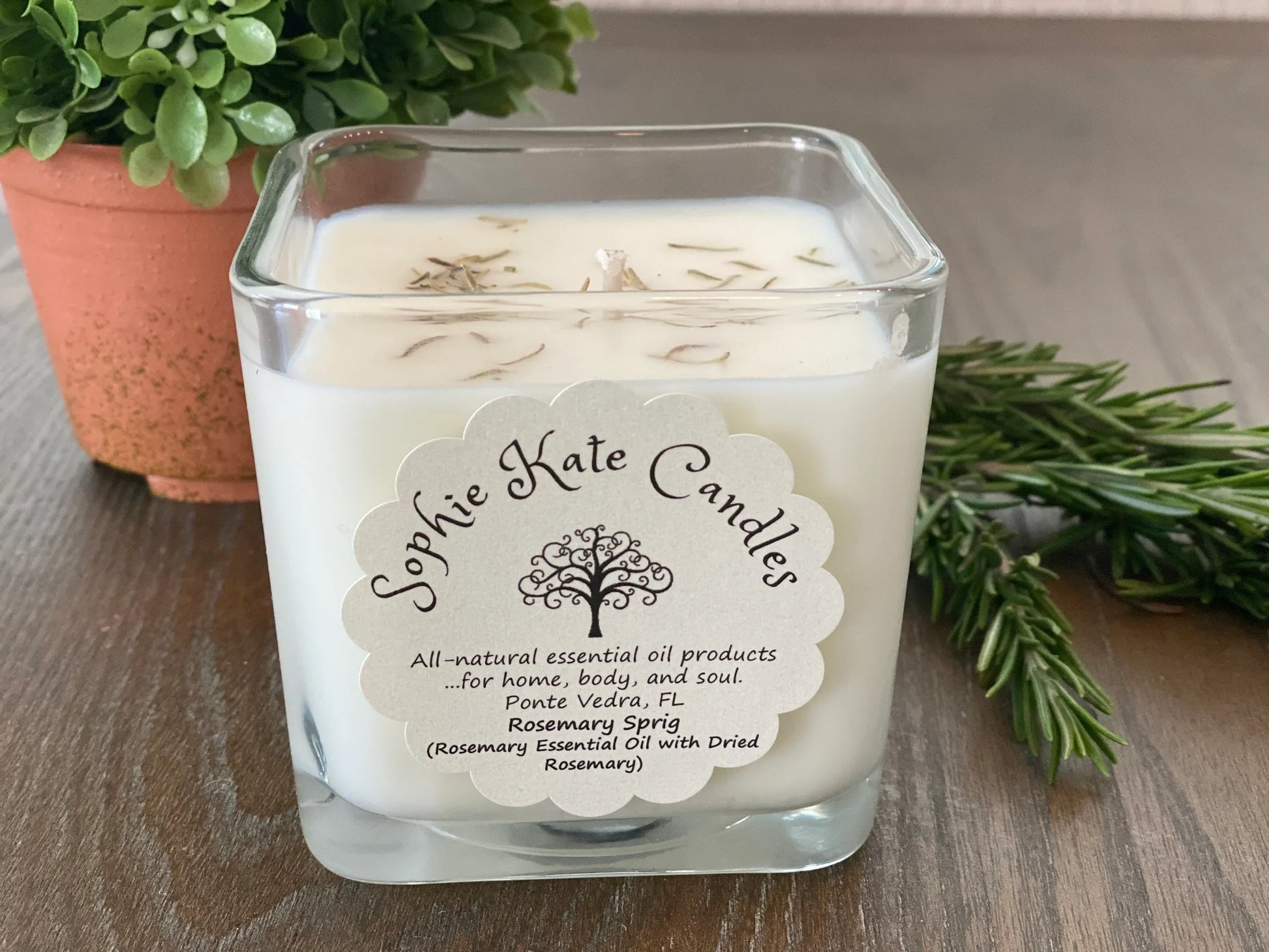 Sophie Kate Candles are aromatherapy candles made with all-natural soy wax and a cotton fiber wick. Our candles contain only the highest quality essential oil/fragrance oil blends that are vegan, non-toxic, and phthalate and paraben free. Unlike store-bought candles that actually emit toxins when they burn, Sophie Kate Candles only release the pleasant aroma and healing properties of the essential oils, with no soot and no tunneling! The Sophie Kate Cube Candle is a 12 oz. candle in a square tumbler with decorative, dried plant material such as dried lavender flowers, dried lemongrass, and dried orange blossom petals that add fragrance and character! These candles will burn 45 hours or more!
